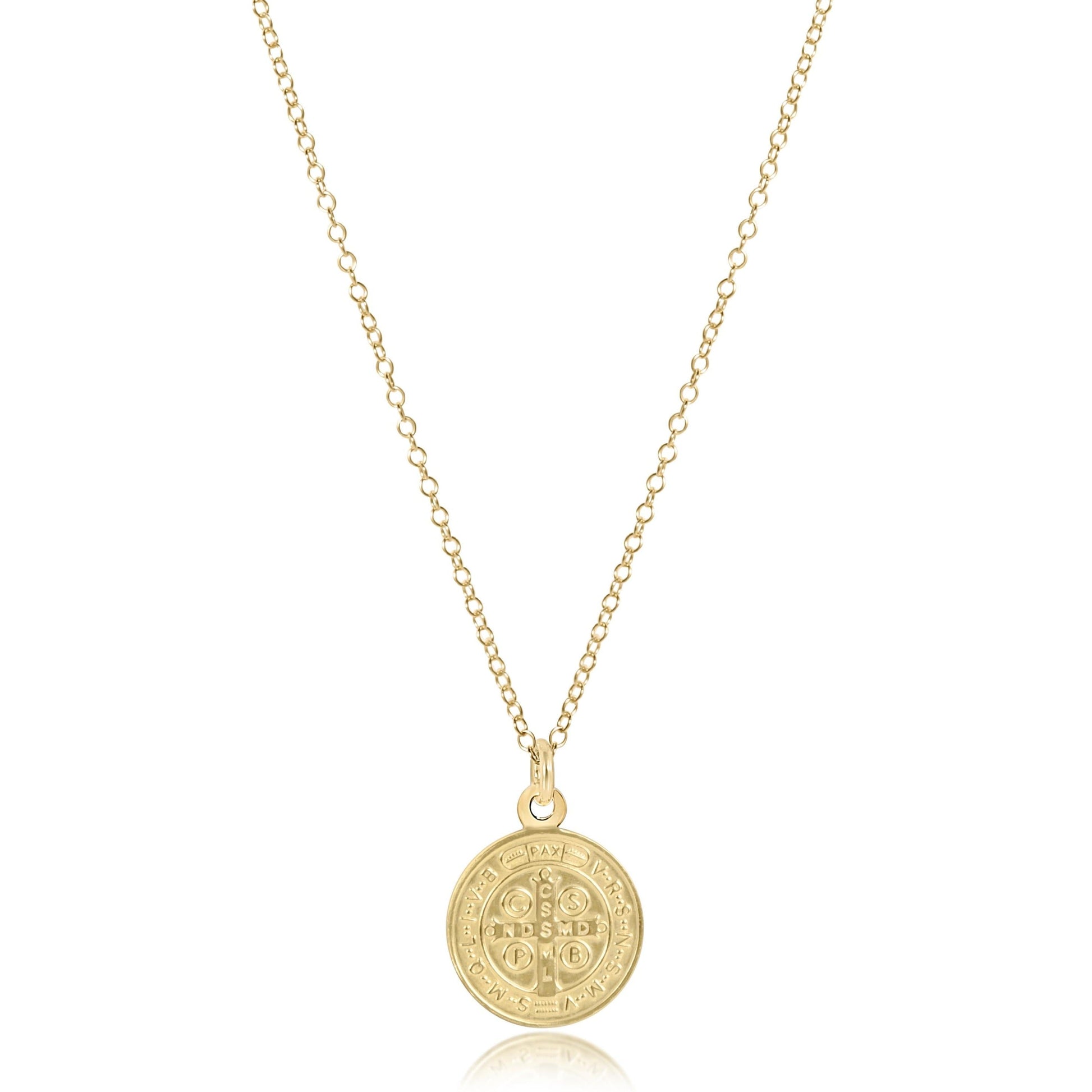 - 14kt gold-filled 12mm blessing disc featuring Saint Benedict