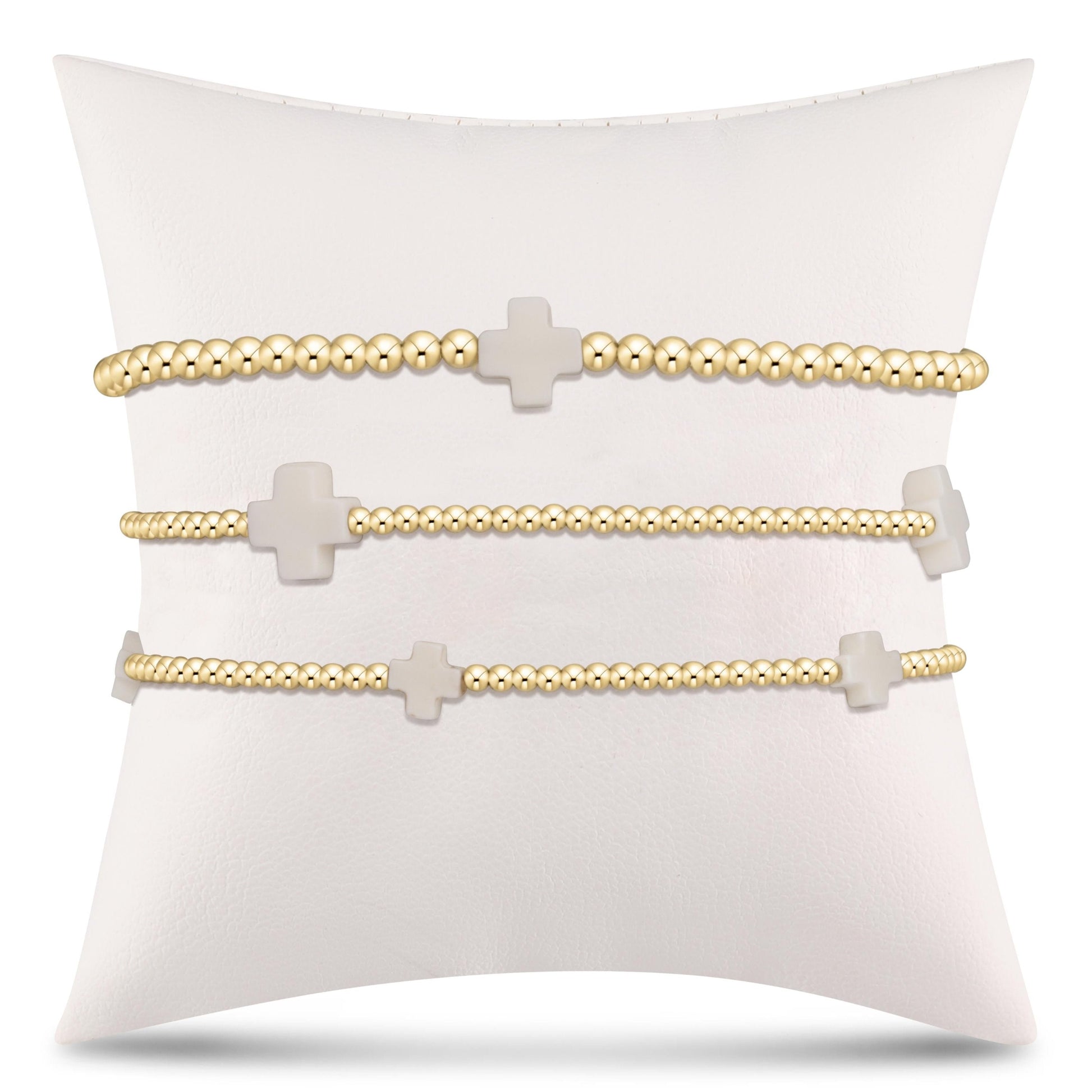 - Bracelet stack of 3 includes: (1) Signature Cross Small Gold Pattern 2mm Bead Bracelet - Off-White, (1) Signature Cross Gold Pattern 2mm Bead Bracelet - Off-White, (1) Signature Cross Gold Pattern 3mm Bead Bracelet - Off-White